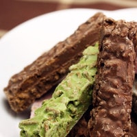 原材料:チョコレート(砂糖、ココアバター、植物油脂、脱脂粉乳、全粉乳、乳糖、カカオマス)、オールブラン(小麦外皮、砂糖、麦芽エキス、食塩)、ガラクトオリゴ糖、アラビノース、デキストリン、抹茶、乳酸菌、ビタミン(B1、B2)、鉄、乳化剤、香料、野菜色素、(原材料の一部に大豆を含む)